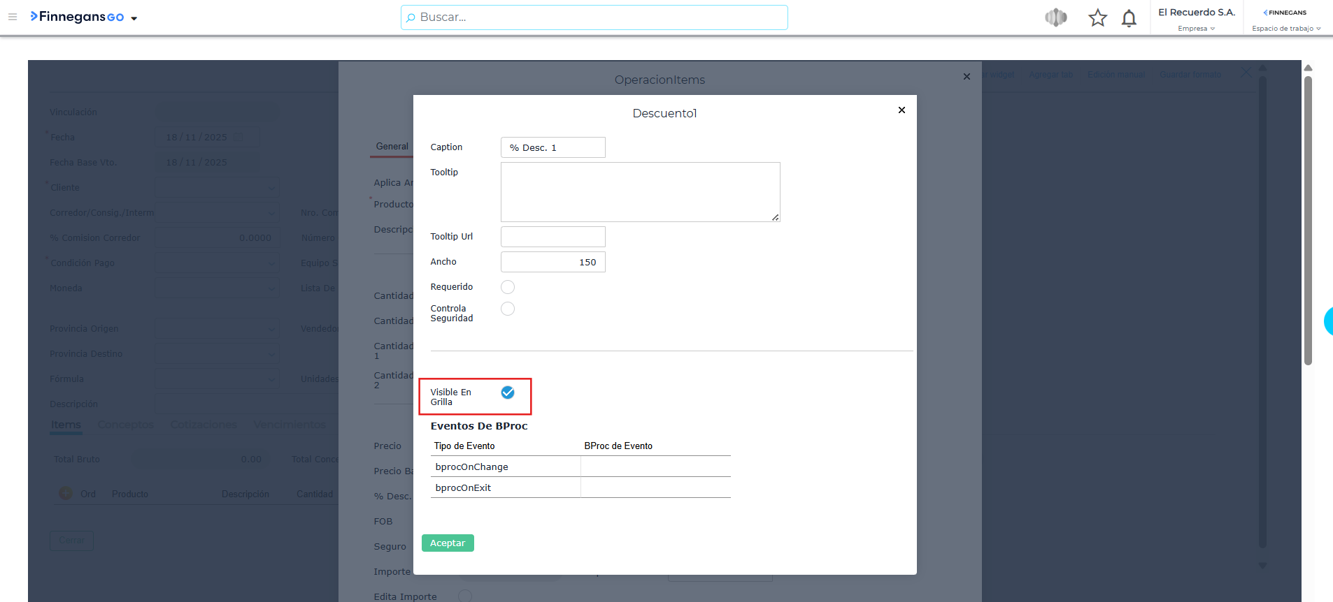 4. Una vez dentro de la configuración del widget, activar el check “Visible En Grilla”. Luego hacer click en Aceptar.