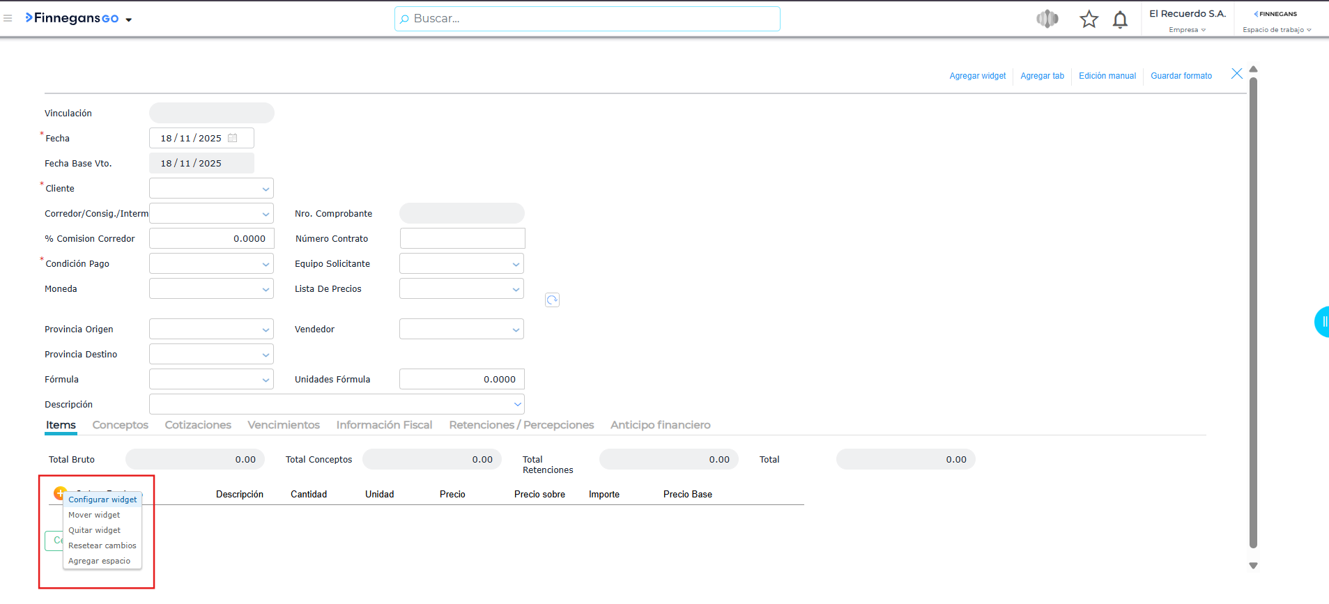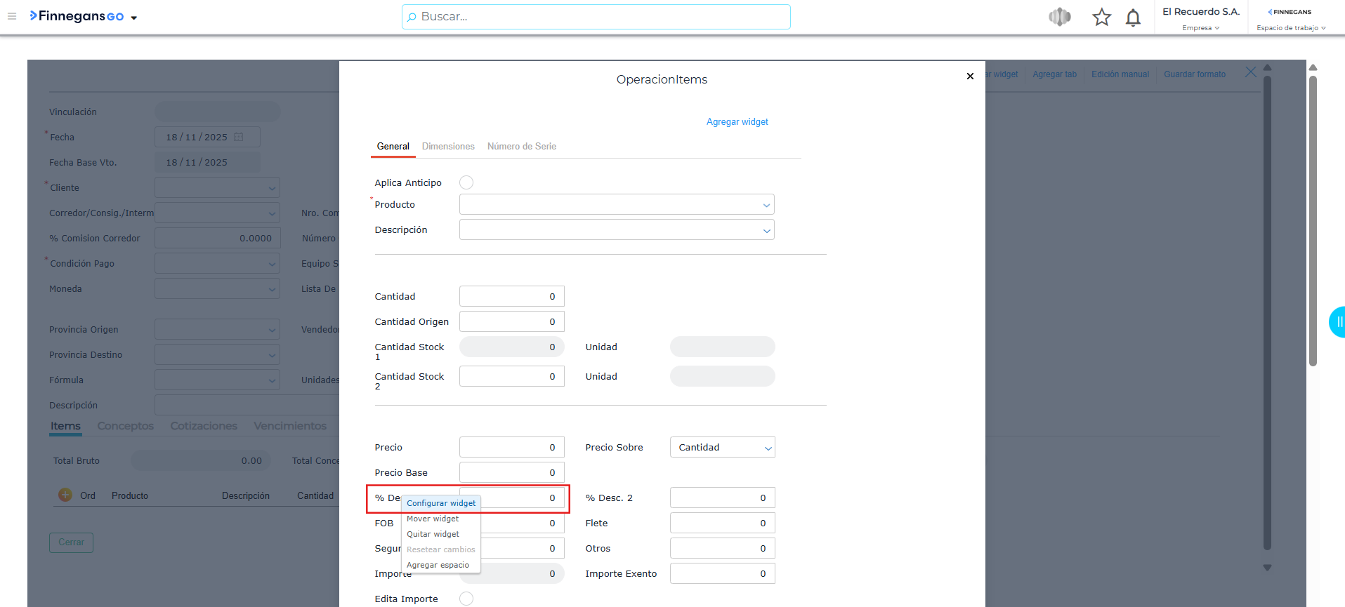 3. Una vez dentro de la configiración, dirigirse al campo deseado, en este caso % Desc. y hacer click derecho sobre el mismo. Una vez que se abra el selector, elegir la opción “Configuración widget”.