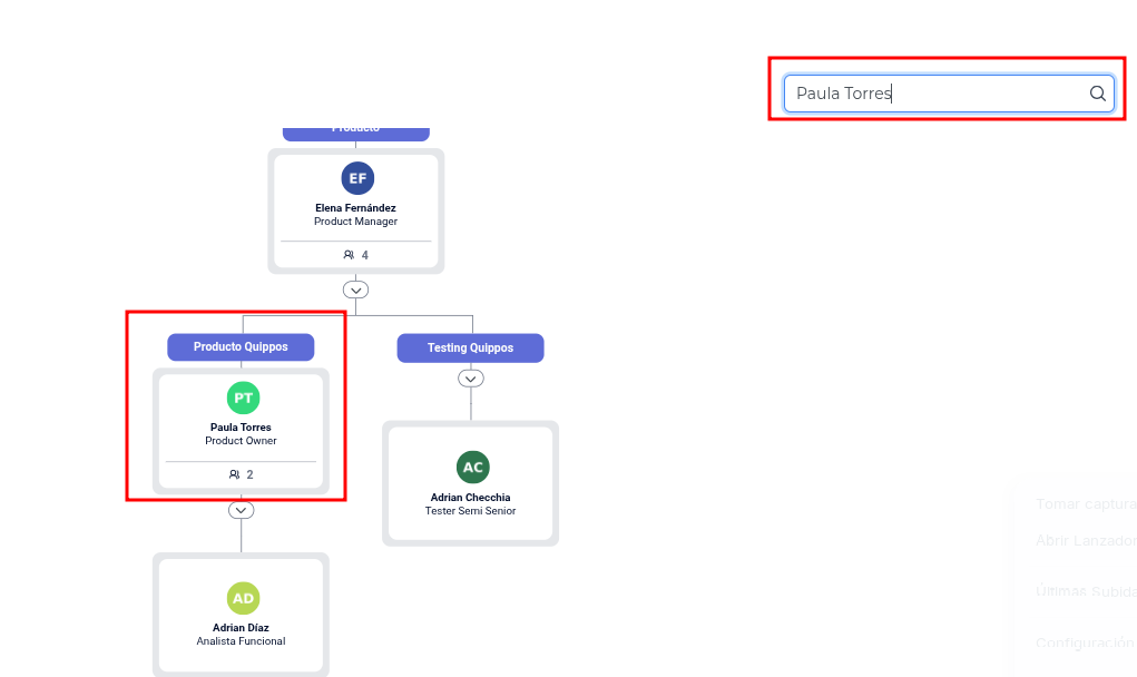La funcionalidad de búsqueda en el organigrama permite localizar de manera rápida y sencilla a un colaborador, un puesto o un área dentro de la estructura organizacional de la compañía, sin necesidad de recorrer manualmente todo el organigrama.