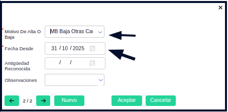 - Ingresar al campo “Motivo Alta o Baja” y presionar el botón ![|28x25]