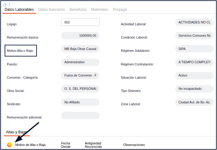 Para registrar la baja de un colaborador es necesario ingresar al legajo e informarla en el campo “motivo de alta o baja”.