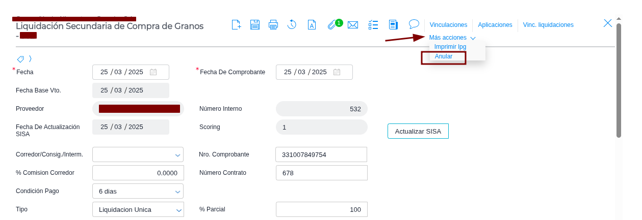- Buscamos la liquidación que queremos anular y desde el botón de Más acciones, vamos a Anular, como muestra la siguiente imagen: