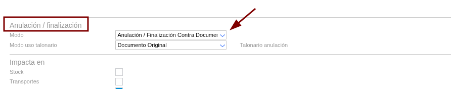 Pero para que esto funcione, debemos realizar un paso previo que es la configuración del tipo de documento: ir al tipo de documento en cuestión (en este caso liquidación secundaria de compra de granos), vamos a la parte final de la solapa General y encontramos el apartado Anulación/Finalización, ahí debemos configurar que anule “contra documento” como se muestra en la siguiente imagen: