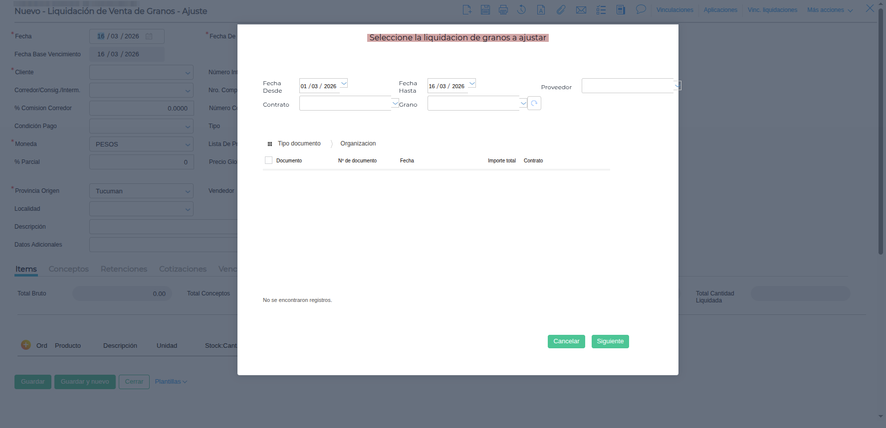 - Se recomienda revisar la siguiente entrada relacionada para asegurar el vínculo correcto: ¿Por qué el Asistente no trae la Liquidación Parcial al intentar realizar una Liquidación de Venta de Granos de Ajuste?