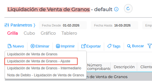 - Presioná el botón “Nuevo” y seleccioná la opción “Liquidación de Venta de Granos - Ajuste”.
