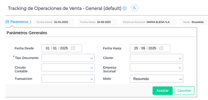 Ruta: Menú → Gestión Empresarial → Informes → Más informes → Tracking de Operaciones de Venta -