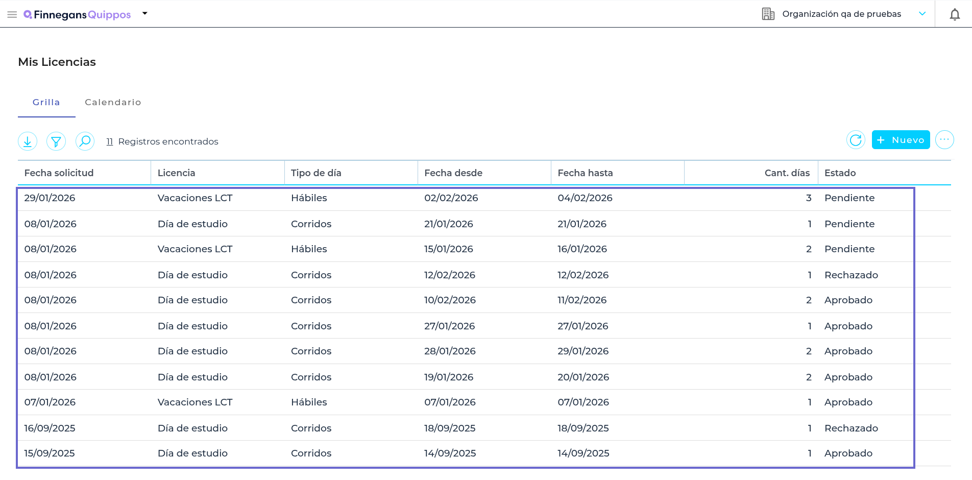 Si hacés click sobre el indicador Mis días disponibles, o si ingresás a Mi Quippos → Mis licencias, podés acceder a la visualización histórica de todos los registros de licencias dentro de Quippos.