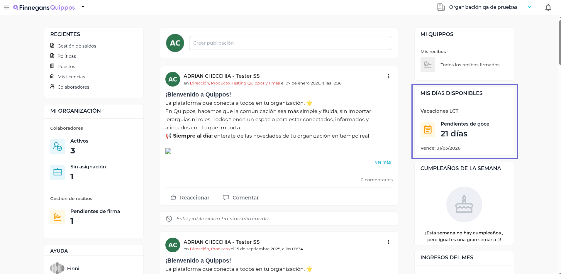 Esta funcionalidad permite a los colaboradores consultar los días de vacaciones disponibles, visualizando los saldos pendientes de goce de las licencias configuradas en Quippos.
