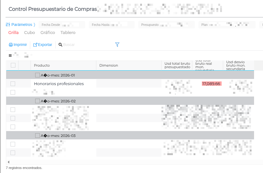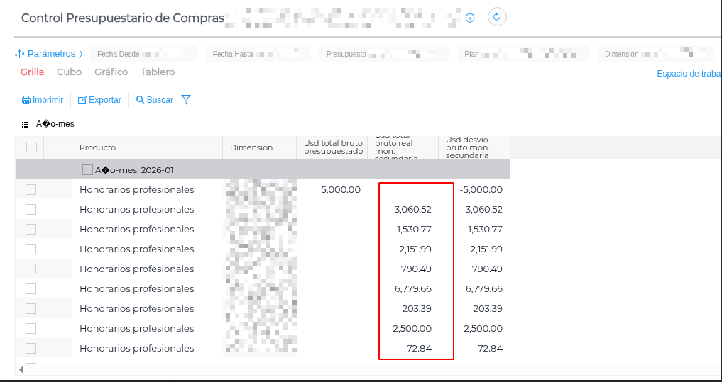 Al visualizar el reporte de Control Presupuestario, el usuario puede percibir una discrepancia o un incremento en la cantidad de registros al habilitar el campo de Dimensión, lo que genera dudas sobre si los importes se están duplicando o mostrando incorrectamente.