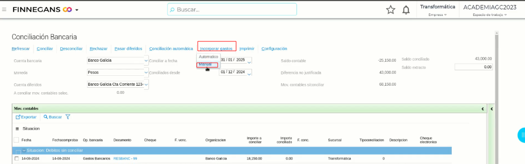 Este instructivo detalla el procedimiento para registrar manualmente los gastos bancarios (comisiones, mantenimientos, impuestos) directamente desde la pantalla de Conciliación Bancaria. Esto permite mantener el saldo contable ajustado a la realidad del banco sin necesidad de salir del módulo.