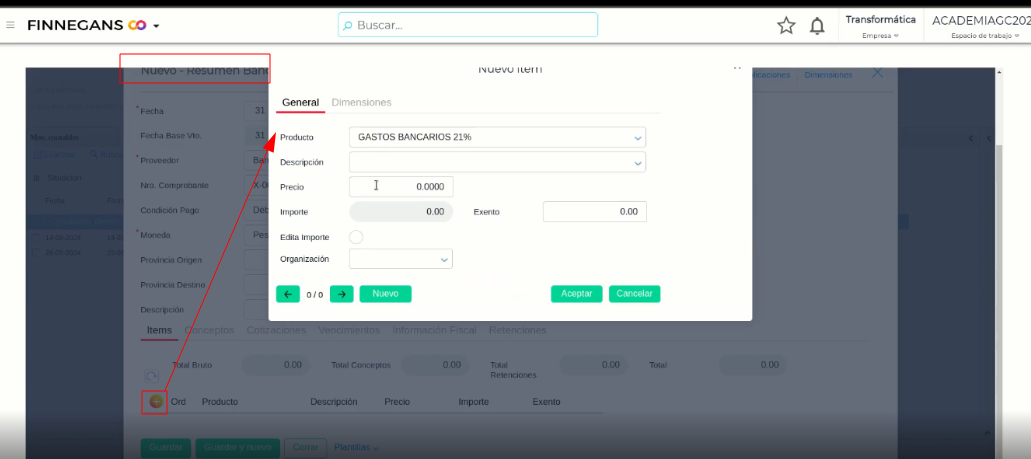En el campo de producto, selecciona el concepto (ej. “Gastos bancarios al 21%”).