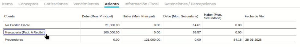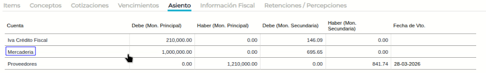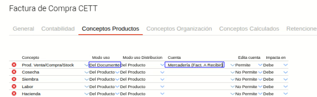 Ejemplo: Al cargar la factura, el usuario selecciona manualmente que desea impactar en Mercadería - Factura a recibir. El sistema forzará esta cuenta para los productos cargados, siempre respetando la coherencia del concepto.