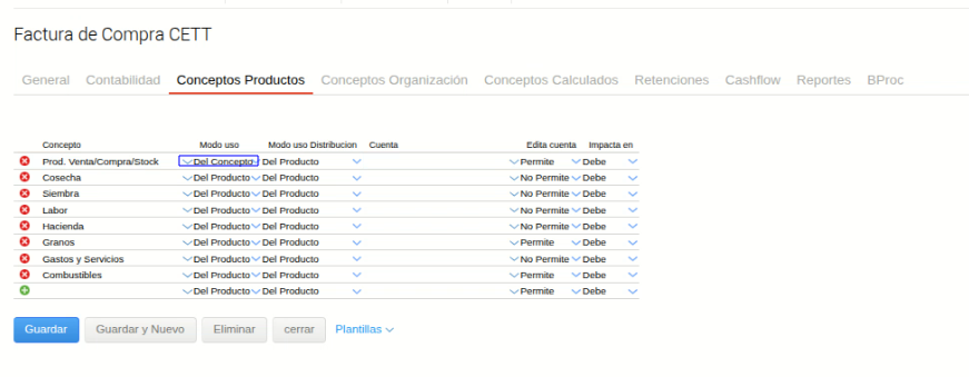 La imputación contable de un producto (Debe/Haber) depende de la relación entre el Maestro de Productos, el Concepto de Producto y el Tipo de Documento.