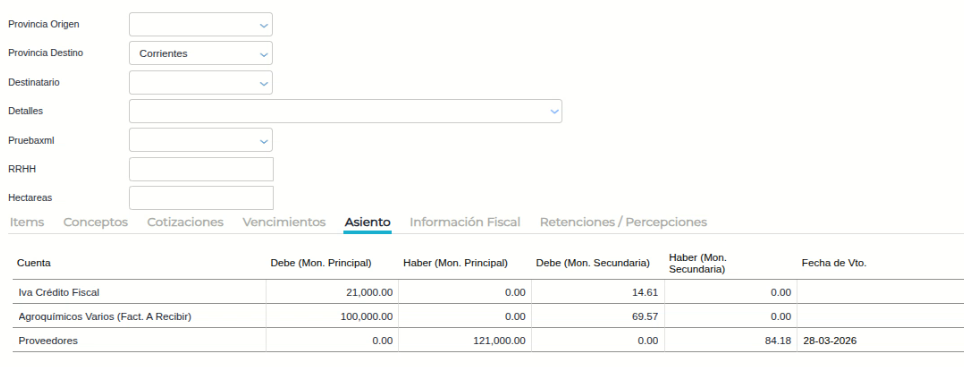 Ejemplo: Si el producto “Agroquímicos” tiene asignada la cuenta Agroquímicos varios - Facturas a recibir, el asiento impactará allí independientemente del concepto general.