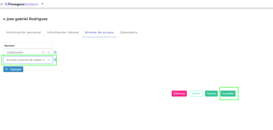 Dentro de la ficha del colaborador, se debe seleccionar la pestaña “Niveles de acceso”.