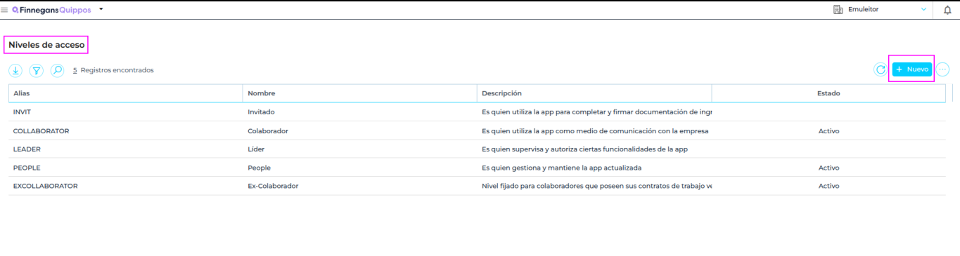 La pantalla de Niveles de acceso muestra un listado de los roles actualmente configurados en el sistema. Para agregar un nuevo rol y definir sus permisos, se debe seleccionar el botón “+ Nuevo” ubicado en la esquina superior derecha de la pantalla.
