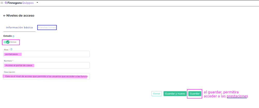 - Nombre: Se debe introducir el nombre completo del nivel de acceso que será visible en el sistema.