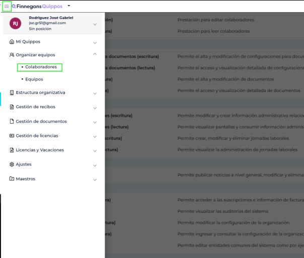 Para asignar el nuevo nivel de acceso a un usuario, se debe ir al menú lateral izquierdo y seleccionar la opción “Colaboradores”.