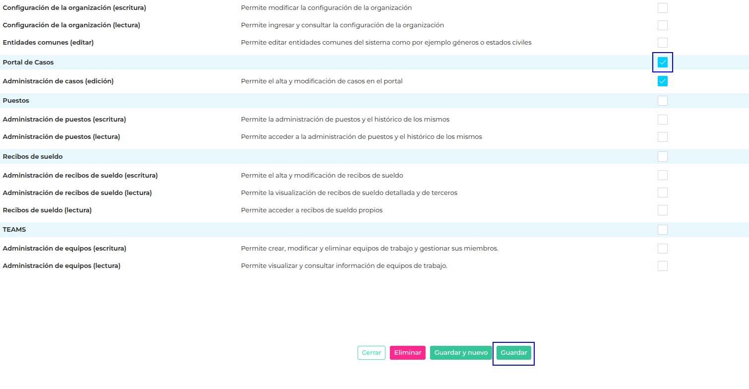 - Proceso de Asignación: Al marcar una casilla en la prestación “Portal de Casos”, se otorga el permiso para la funcionalidad específica.