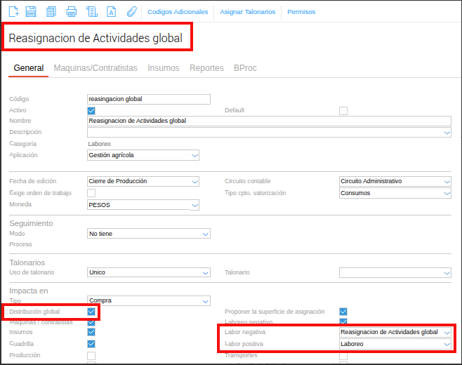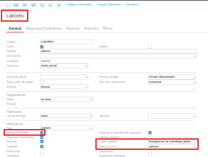 obligatorio que tanto el documento de Laboreo como el de Reasignación de Actividades (positivo y negativo) compartan la misma configuración de distribución.