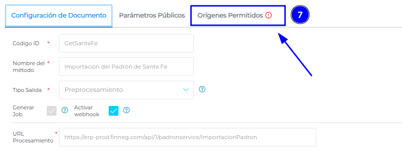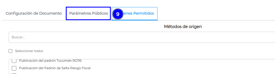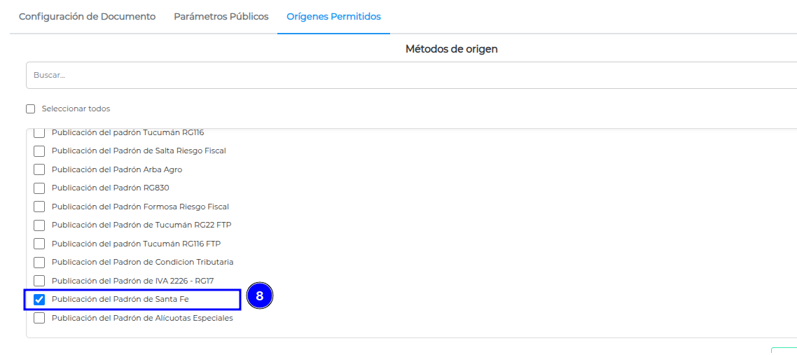 Ahora, en la solapa Orígenes Permitidos, buscar y activar en el selector la opción “Publicación del Padrón de Santa Fe”.