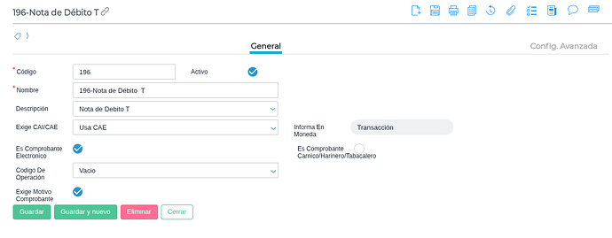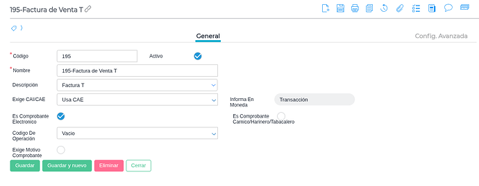 - Talonario: El formato del talonario debe ser “T-#####-########” y debe apuntar a un Comprobante Tipo Impositivo electrónico.