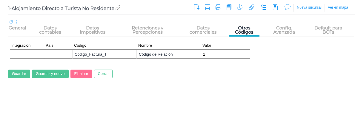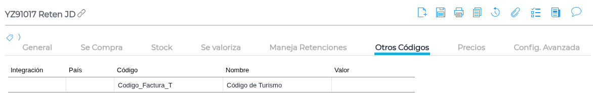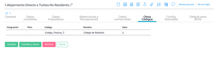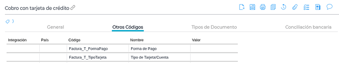 En la solapa Otros Códigos , agrega el registro “Código_Factura_T”. En la columna Valor , utiliza estos códigos según el servicio: