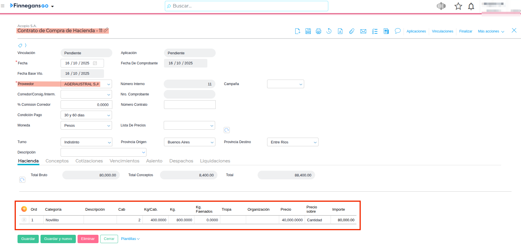 Gestión Empresarial →Compra de hacienda → Contrato de Hacienda.