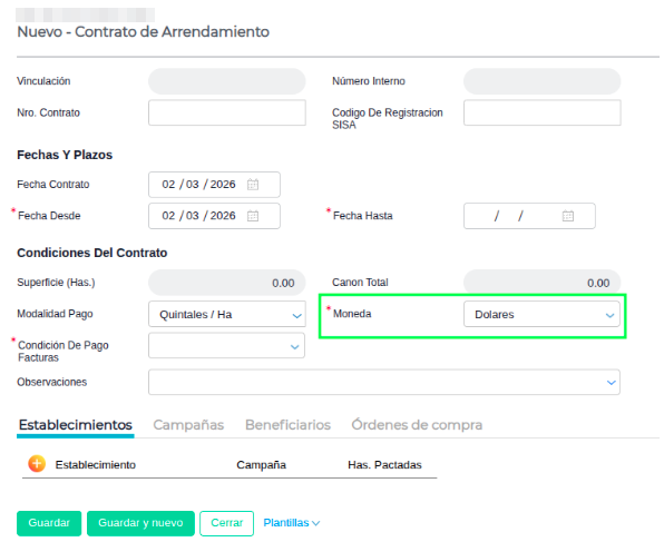 1. Moneda del Contrato: Verificá qué moneda estás utilizando en la cabecera del Contrato de Arrendamiento.