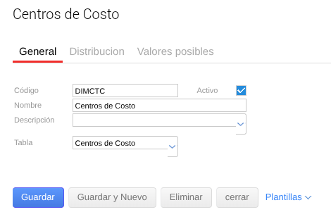 DIMENSIONVALOR: Ingresa el código de la Distribución. (Maestro o tabla a la cual apunta la dimensión. Alfanumérico). Por ejemplo, si se indicó la dimensión Centro de Costo en la columna “DIMENSION”, en esta columna se deberá indicar el código del Centro de Costo donde se imputará el Contrato. Para ver los códigos, ingresar a Menú → Gestión empresarial → Contabilidad → Centros de costos y completar la columna con el código de algún registro dentro de este maestro.