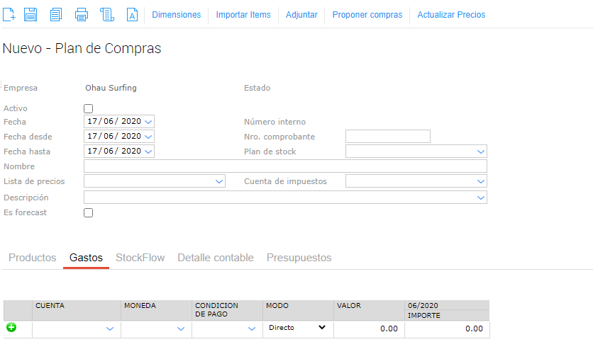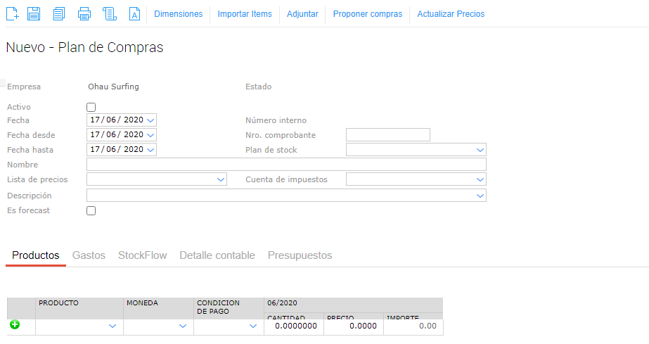 Para generar un nuevo Plan de Stock Inicial se accede desde Menú → Gestion Empresarial → Presupuesto → Transacciones → Planes → Nuevo → Plan de Stock Inicial.