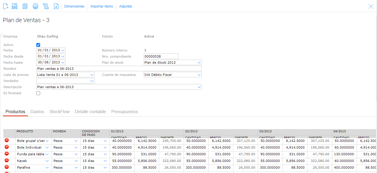 - Activo: indica si el plan creado se encuentra o no disponible para su utilización en otras transacciones. El plan va a seguir disponible para su consulta en los distintos reportes del sistema donde intervenga, aunque el mismo ya no esté activo.