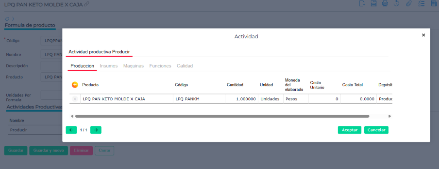 Revisar la solapa Actividades Productivas para confirmar que el costo se haya actualizado correctamente.