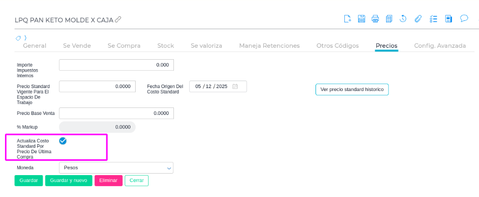 Esto implica que el sistema actualiza automáticamente el costo estándar del producto en función del precio de la última compra registrada. Al estar habilitado, este comportamiento reemplaza la actualización manual realizada por el MRP, evitando que el costo estándar tome el valor calculado a partir de las fórmulas de producción.