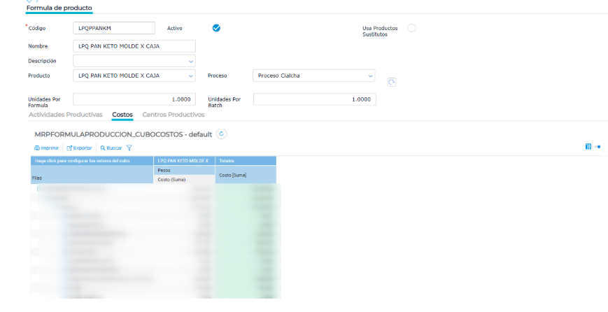 En la vista de fórmulas de producción, tengo un producto que está marcado como elaborado y que, en la solapa de Costos, tiene todos los costos definidos. Sin embargo, a pesar de ejecutar varias veces el proceso MRP – Actualización de Costo Standard, en la solapa de Actividades Productivas el valor del producto permanece en 0 y no se actualiza.