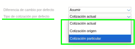 En el campo “Tipo de Cotización por defecto”, selecciona la opción que prefieras (Actual, Origen o Particular).