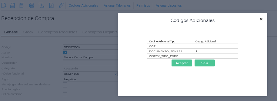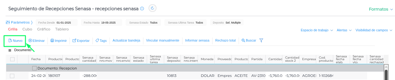 Si el tipo no está correctamente configurado, la recepción no será visible en la view SENASA.