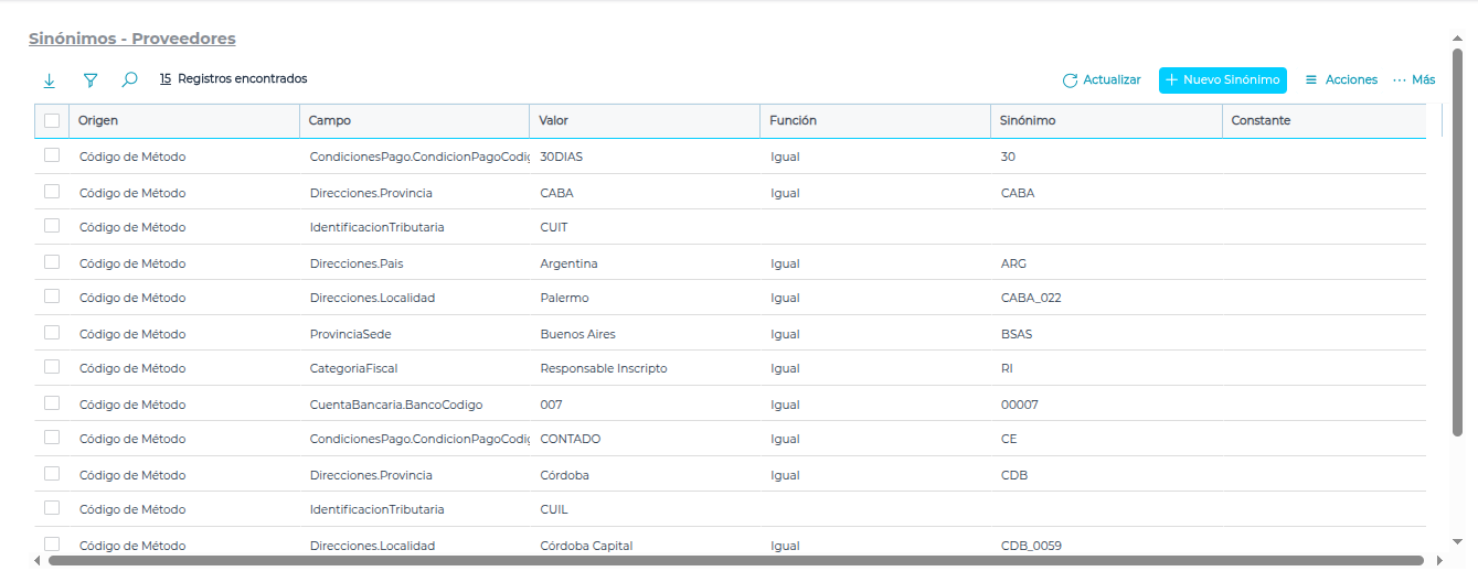 Los siguientes campos deben configurarse como sinonimizables para permitir el mapeo entre valores externos e internos: