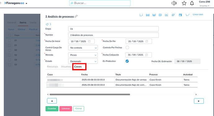 Los casos visualizados corresponden únicamente a aquellos que mantienen vínculo activo con el ítem. En caso de que un caso se elimine o finalice, dejará de mostrarse automáticamente en la grilla.