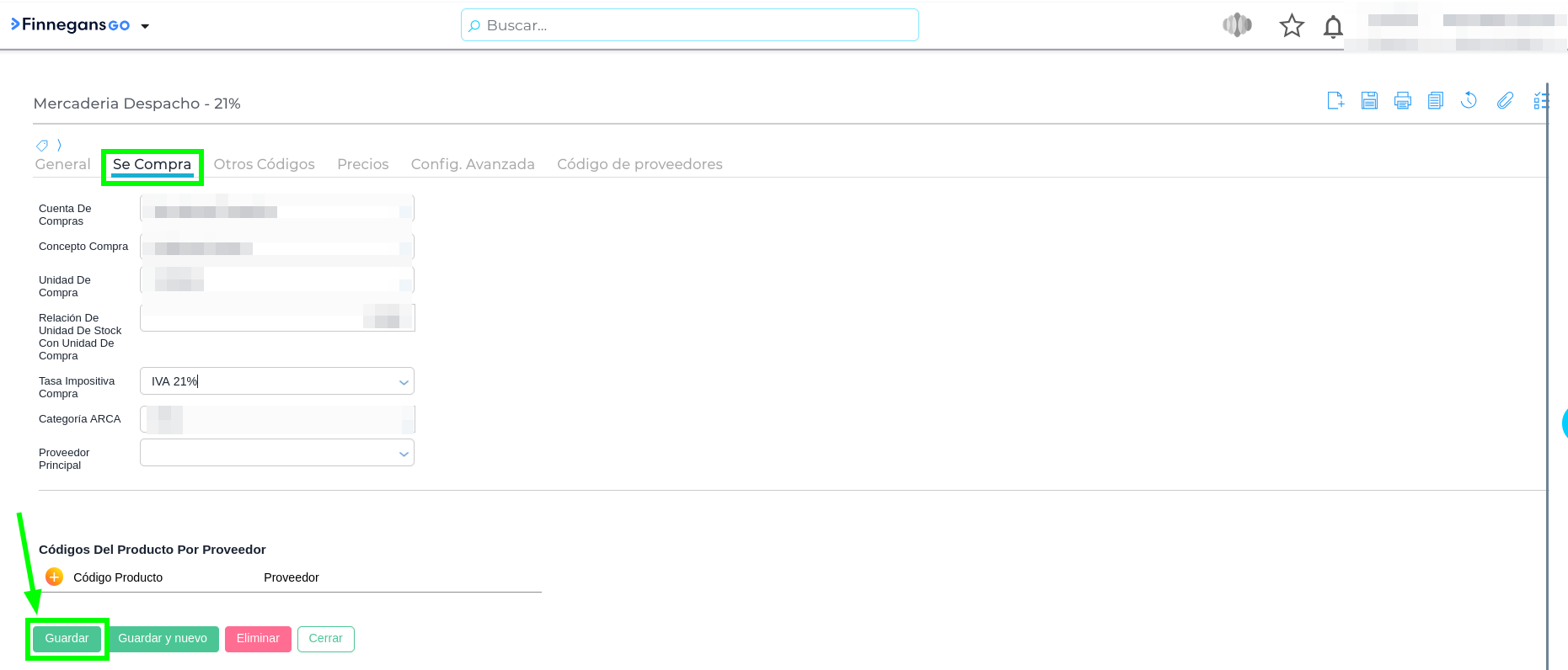 - Asegúrate de que el campo “Tasa Impositiva Compra” esté completo con la tasa impositiva correcta (Ejemplo: 21%).