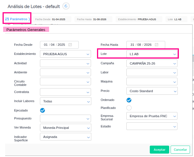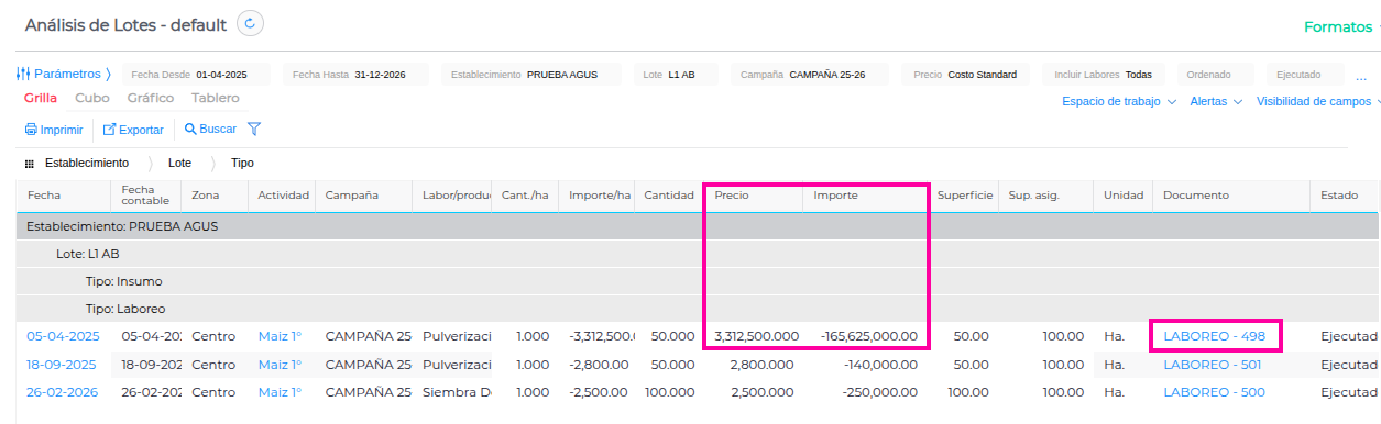 Al consultar el Análisis de Lotes, es posible observar que el precio y el importe de un laboreo no coinciden con los valores cargados originalmente en el documento. Esto sucede habitualmente cuando el laboreo fue registrado en una moneda distinta a la seleccionada en los parámetros del informe (Moneda Principal o Secundaria). El sistema realiza una conversión automática utilizando la cotización pactada en el laboreo para asegurar que todos los costos del lote se expresen en una misma unidad de medida.