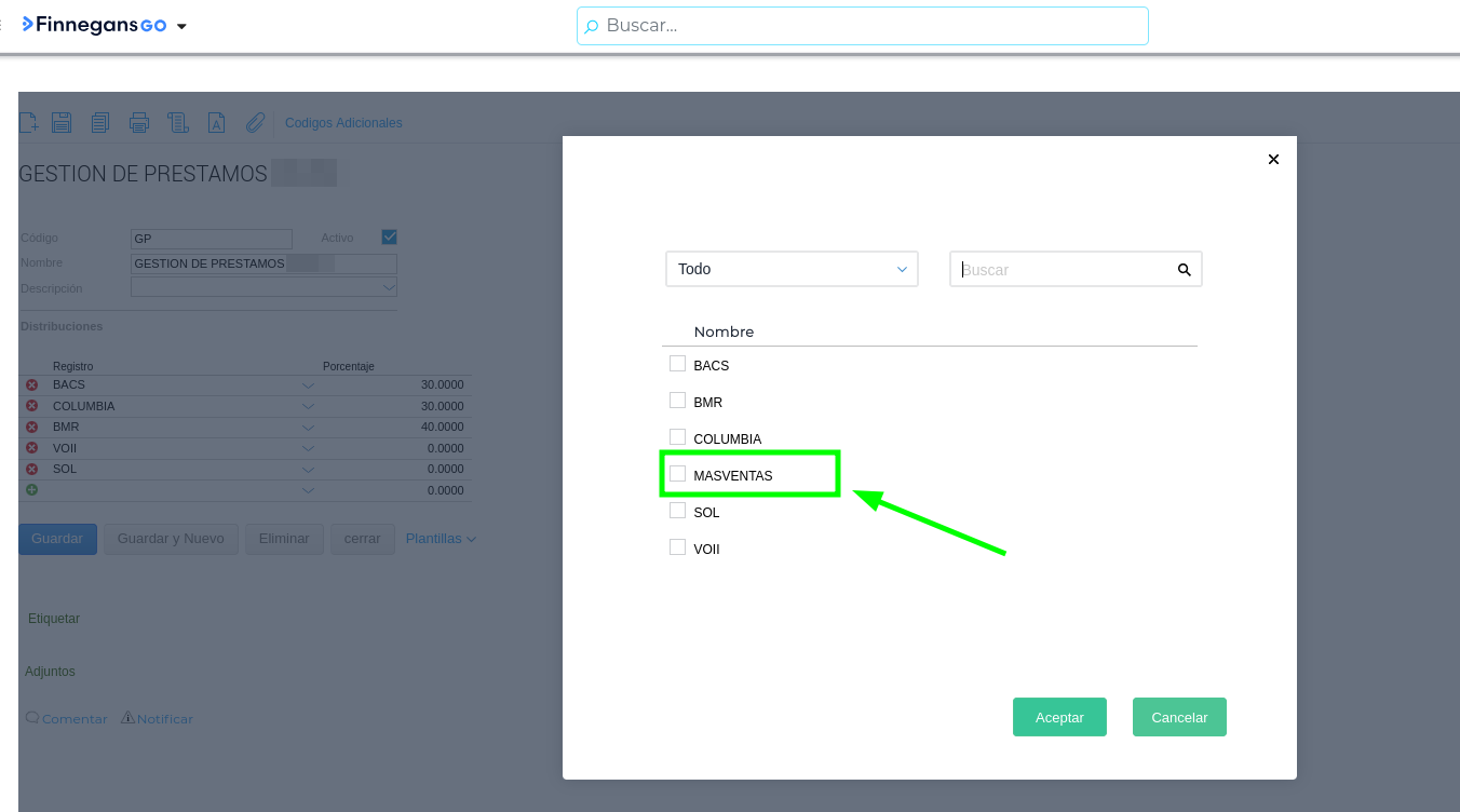 Asignar en la Dimensión: Regresar a la pantalla de la Dimensión Gestion de Prestamos y buscar el registro recién creado (Ej: MASVENTAS). Ahora aparecerá disponible en el listado para ser seleccionado.