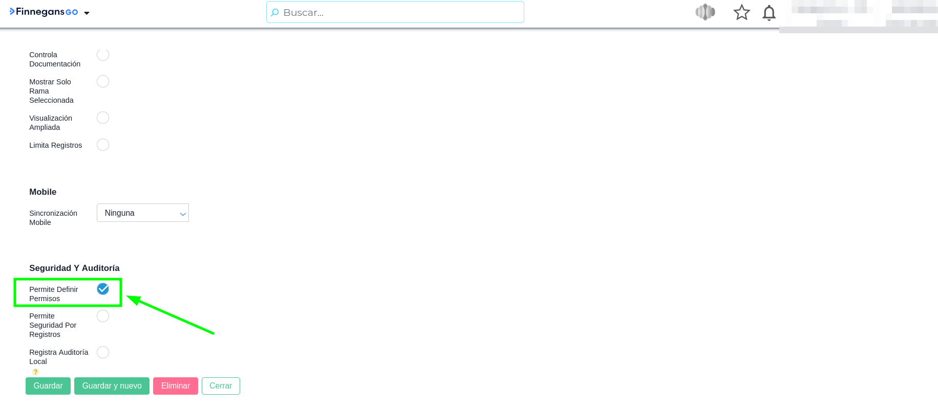 - En la sección Seguridad y Auditoría, activa el check “Permite Definir Permisos”