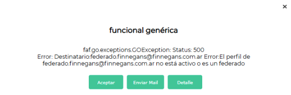 El error se produce porque el usuario técnico Federado FG (o la dirección de correo federado.finnegans@finnegans.com.ar) se encuentra incluido dentro de un equipo de trabajo operativo. Los usuarios de tipo “Federado” no deben formar parte de los Equipos Solicitantes o Autorizantes, ya que su función es de sistema y no poseen un perfil activo para participar en el flujo de documentos de compras