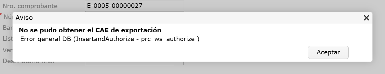 Al intentar realizar la autorización de un comprobante de exportación para obtener el CAE, el proceso falla devolviendo un error de base de datos interno del organismo regulador.