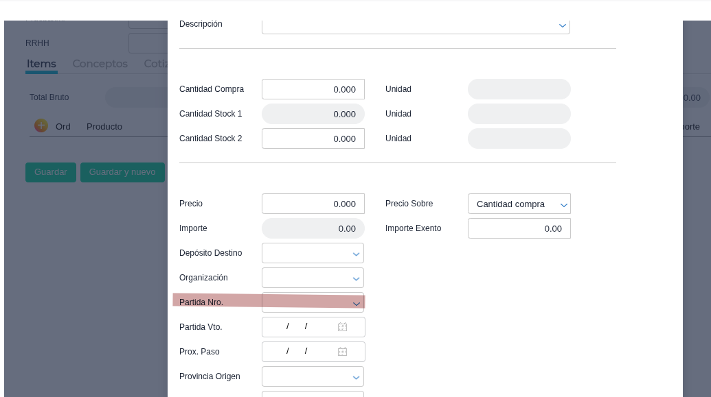 - Si el producto está parametrizado para usar partidas, el flujo ideal es cargar o asociar la partida en la Orden de Compra (si es un producto que se genera a pedido y su partida es conocida previamente) o, de forma más común, vincular los Remitos (documentos de recepción) que sí contienen la partida.