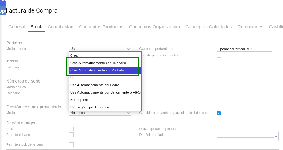 Al utilizar el “Bot de Compras” para generar una Factura de Compra a partir de una Orden de Compra, el sistema intenta contabilizar la factura. Si el producto comprado está configurado para requerir una partida (“Usa” en modo de partida), la contabilización fallará si la información de la partida no está presente.