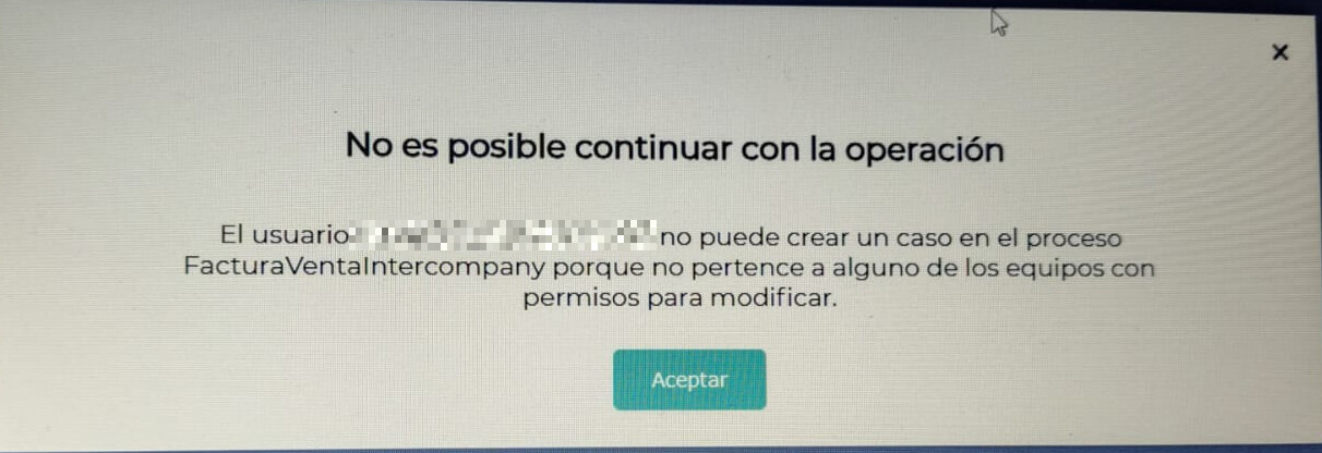 “No es posible continuar con la operación. El usuario [Nombre] no puede crear un caso en el proceso FacturaVentaIntercompany porque no pertenece a alguno de los equipos con permisos para modificar.”