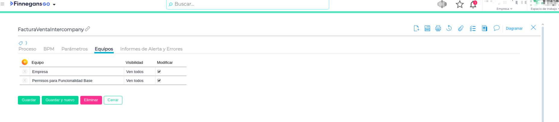 Dentro del sistema ciertos procesos de negocio (Workflows) están restringidos a equipos específicos. Si el proceso FacturaVentaIntercompany está configurado para ser operado solo por los equipos “Empresa” o “Permisos para funcionalidad básica”, cualquier usuario que no esté incluido explícitamente en esos equipos no podrá ejecutar la acción, aunque tenga permisos de acceso al módulo.