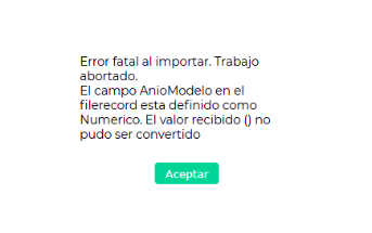 “Error fatal al importar . trabajo abortado. el campo aniomodelo en el filerecord esta definido como numerico. el valor recibido () no puede ser convertido”